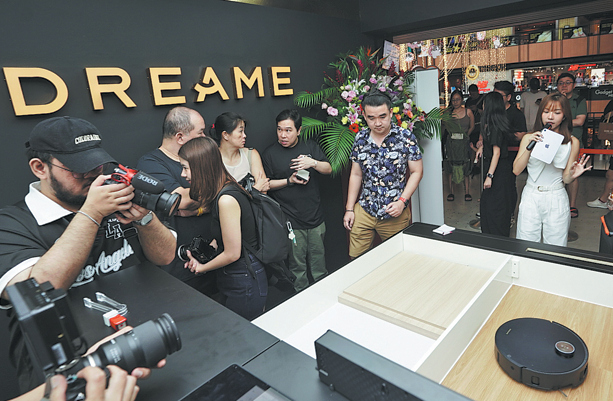 El 3 de enero, varias personas tomaron fotos de una aspiradora robot en la inauguración de la tienda insignia de Dreame en Singapur. CHINA DAILY