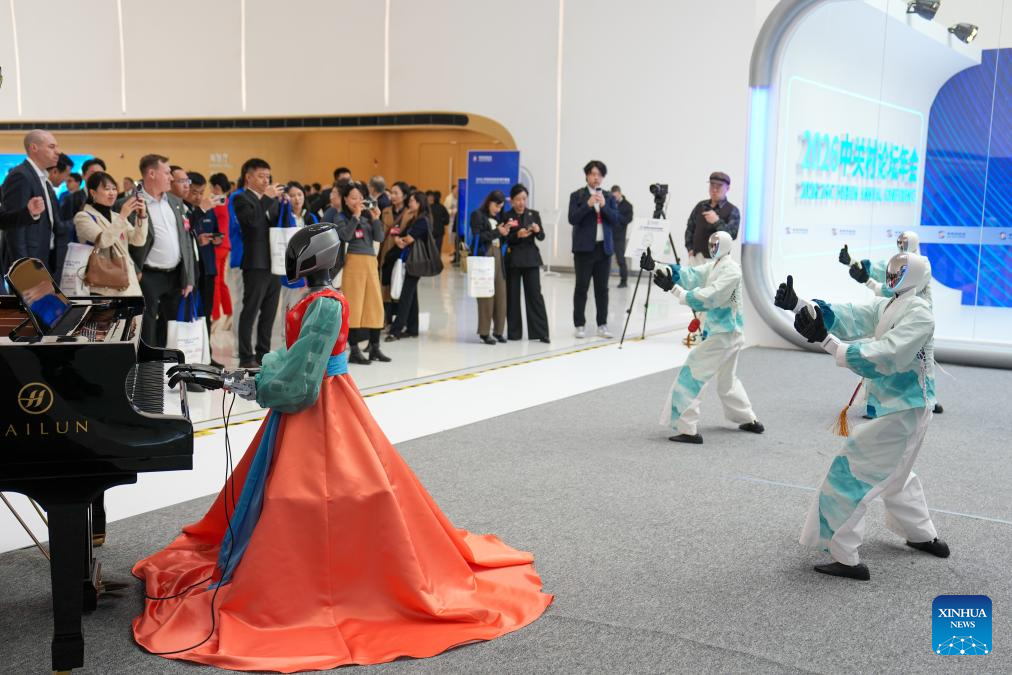 Robots humanoides tocan instrumentos musicales y bailan en el Centro Internacional de Innovación de Zhongguancun, en Beijing, capital de China, el 25 de marzo de 2026. El Foro Zhongguancun 2026 se lleva a cabo del 25 al 29 de marzo bajo el tema "Integración plena entre la innovación tecnológica y la innovación industrial". (Xinhua/Ju Huanzong)