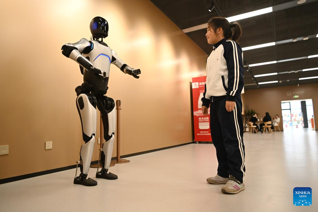 Imagen del 25 de marzo de 2026 de una niña interactuando con un robot en una biblioteca, en la Nueva Área de Xiong'an, en la provincia de Hebei, en el norte de China. Aproximadamente a una hora en automóvil de Beijing, una ciudad futurista está surgiendo en la llanura del norte de China: la Nueva Área de Xiong'an. (Xinhua/Zhu Xudong)