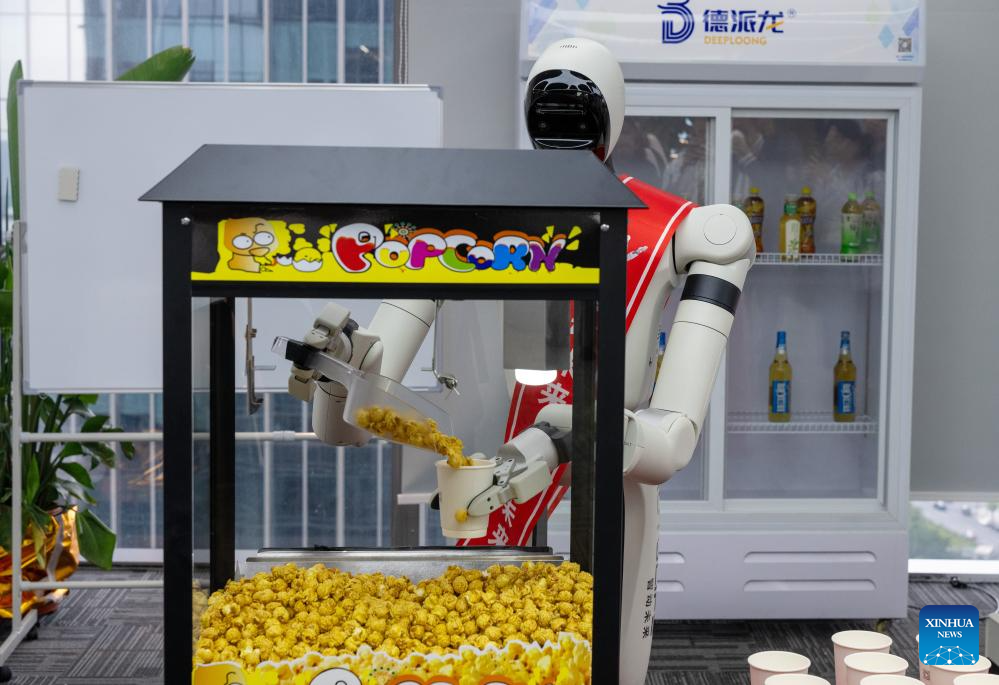 Imagen del 26 de marzo de 2026 de un robot vendiendo palomitas de maíz en una empresa, en Guangzhou, en la provincia de Guangdong, en el sur de China. En los últimos años la provincia de Guangdong ha adoptado diversas medidas para explorar el desarrollo y la aplicación de la inteligencia artificial (IA) incorporada. Clústeres industriales líderes a nivel nacional están en auge en ciudades como Shenzhen y Guangzhou, en la provincia. Actualmente, Guangdong está acelerando las innovaciones en IA y robótica en sectores que incluyen el cuidado de la salud, la educación, la gestión urbana y las industrias especializadas. (Xinhua/Liu Mengqi)