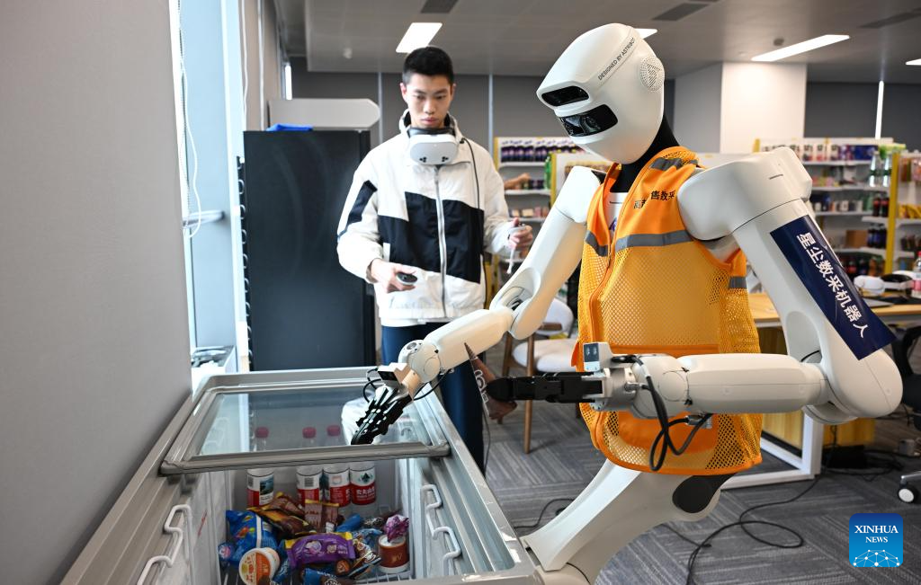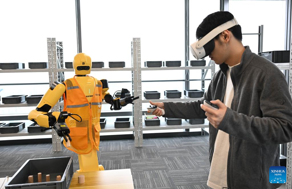 Imagen del 7 de abril de 2026 de un trabajador entrenando a un robot en la organización de carga bajo un entorno simulado en un centro provincial de entrenamiento de inteligencia artificial (IA) incorporada, en Guangzhou, en la provincia de Guangdong, en el sur de China. En los últimos años la provincia de Guangdong ha adoptado diversas medidas para explorar el desarrollo y la aplicación de la IA incorporada. Clústeres industriales líderes a nivel nacional están en auge en ciudades como Shenzhen y Guangzhou, en la provincia. Actualmente, Guangdong está acelerando las innovaciones en IA y robótica en sectores que incluyen el cuidado de la salud, la educación, la gestión urbana y las industrias especializadas. (Xinhua/Deng Hua)