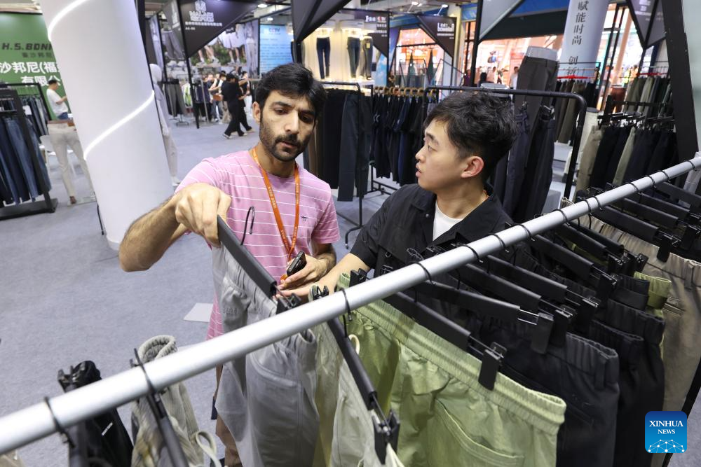 Un comerciante extranjero habla con un expositor durante la 28ª Feria de Textiles y Vestimenta del Estrecho, en Shishi, en la provincia de Fujian, en el sureste de China, el 18 de abril de 2026. La feria comenzó aquí el sábado. (Xinhua/Jiang Kehong)